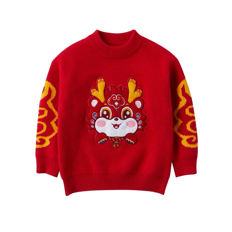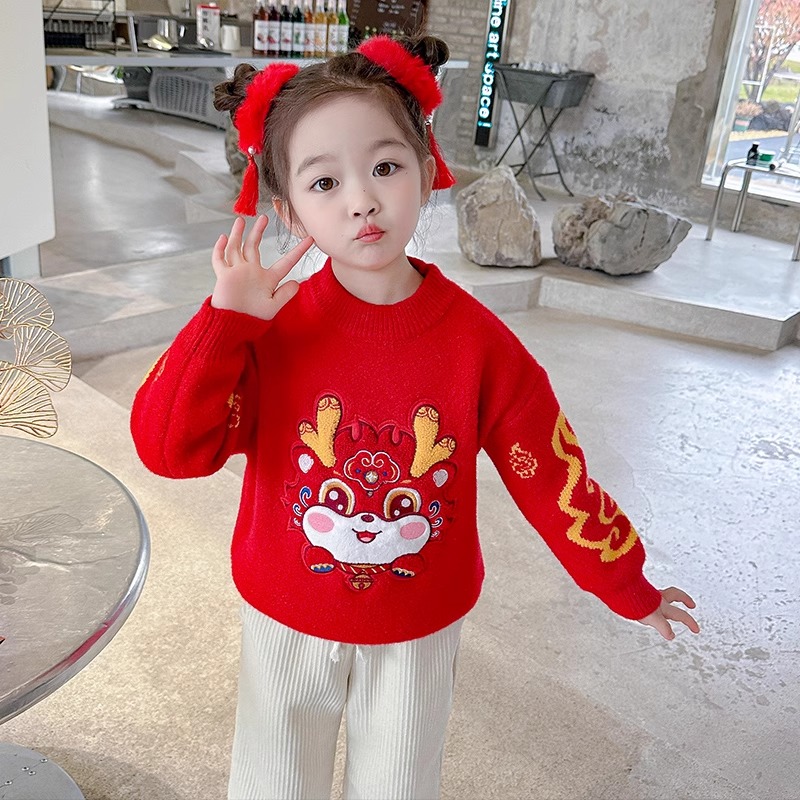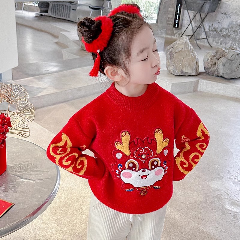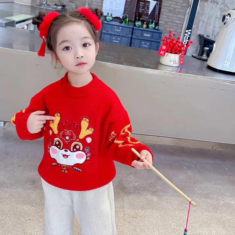 女童拜年服儿童过年喜庆衣服冬季新年毛衣红色冬款加绒针织打底衫