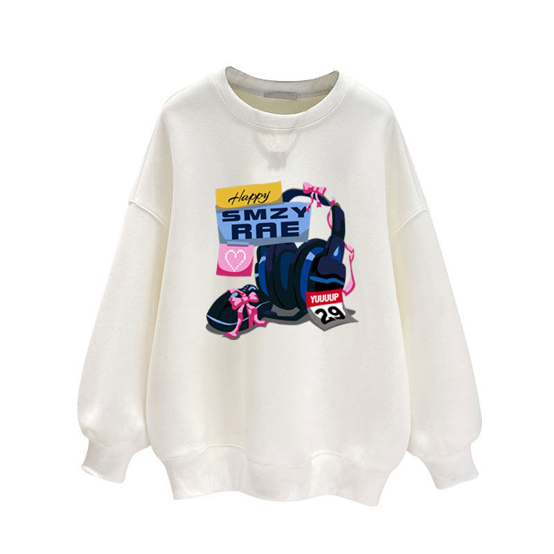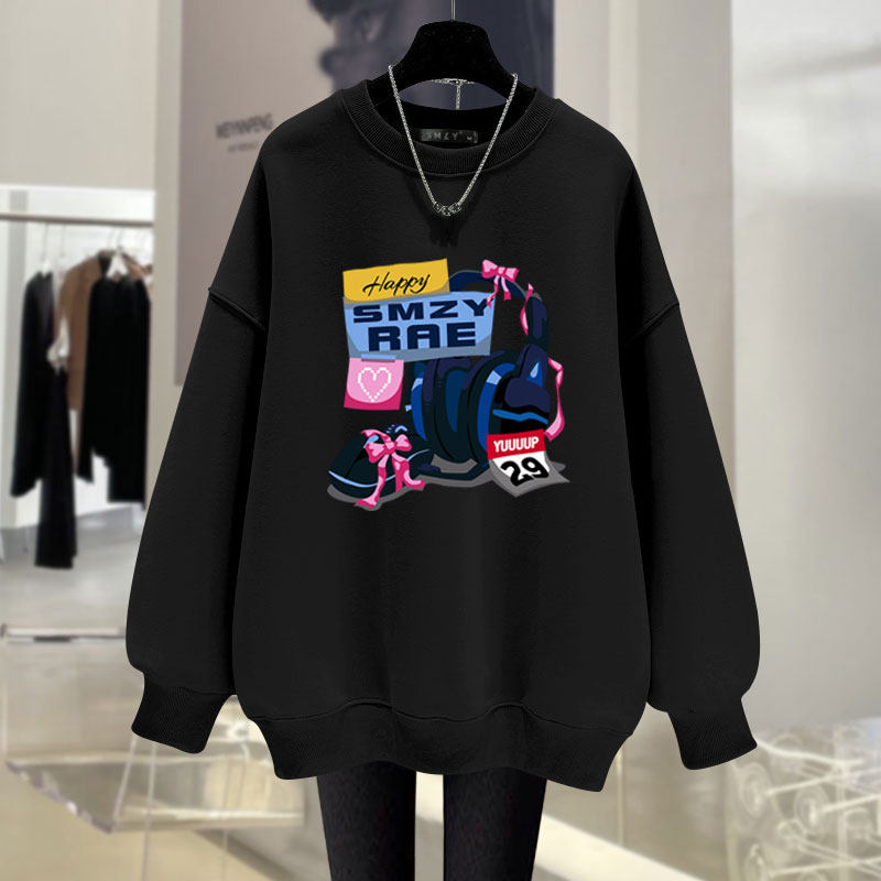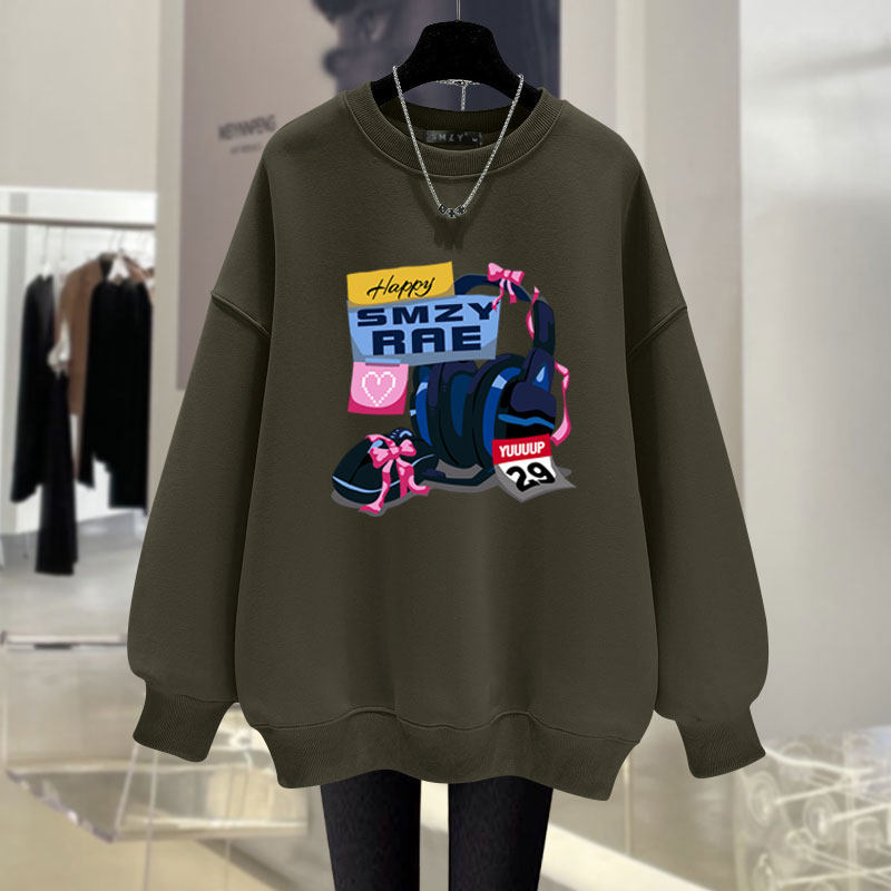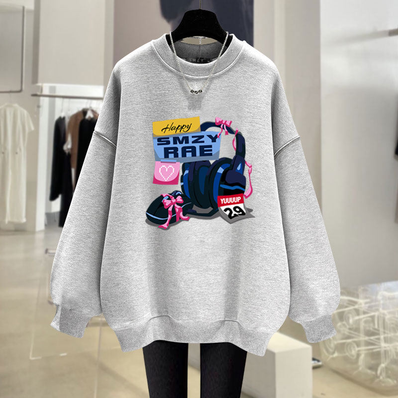 2025春秋冬季蝴蝶结耳机印花中长款加绒加厚宽松套头圆领卫衣女潮