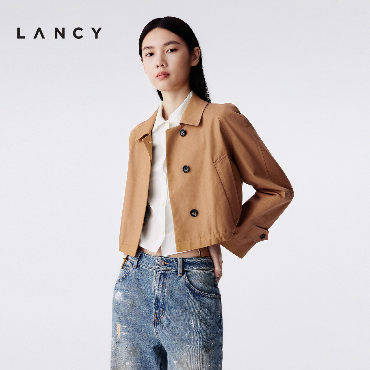 LANCY/朗姿2025年冬新款简约休闲纯棉翻领抽绳短外套女工装风夹克