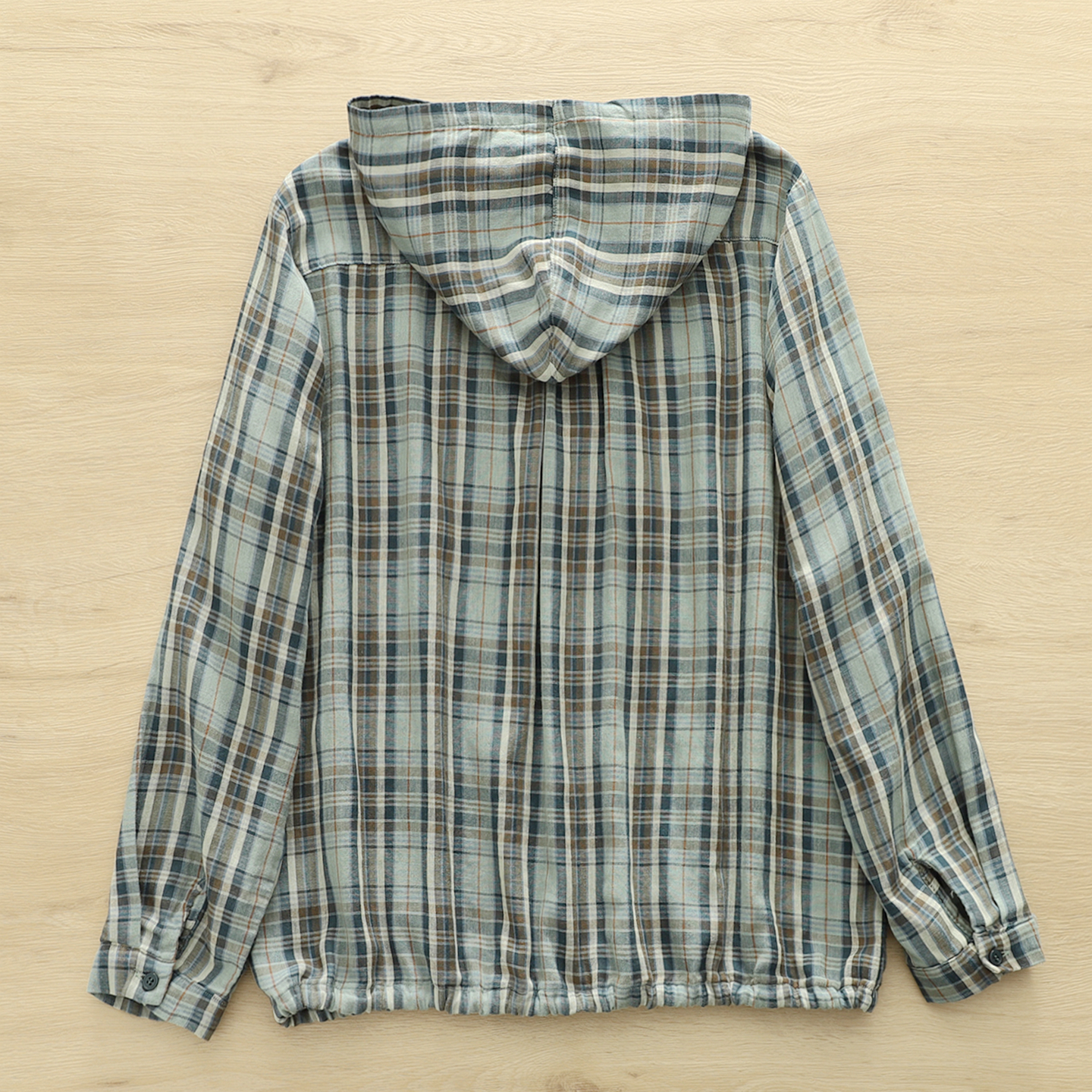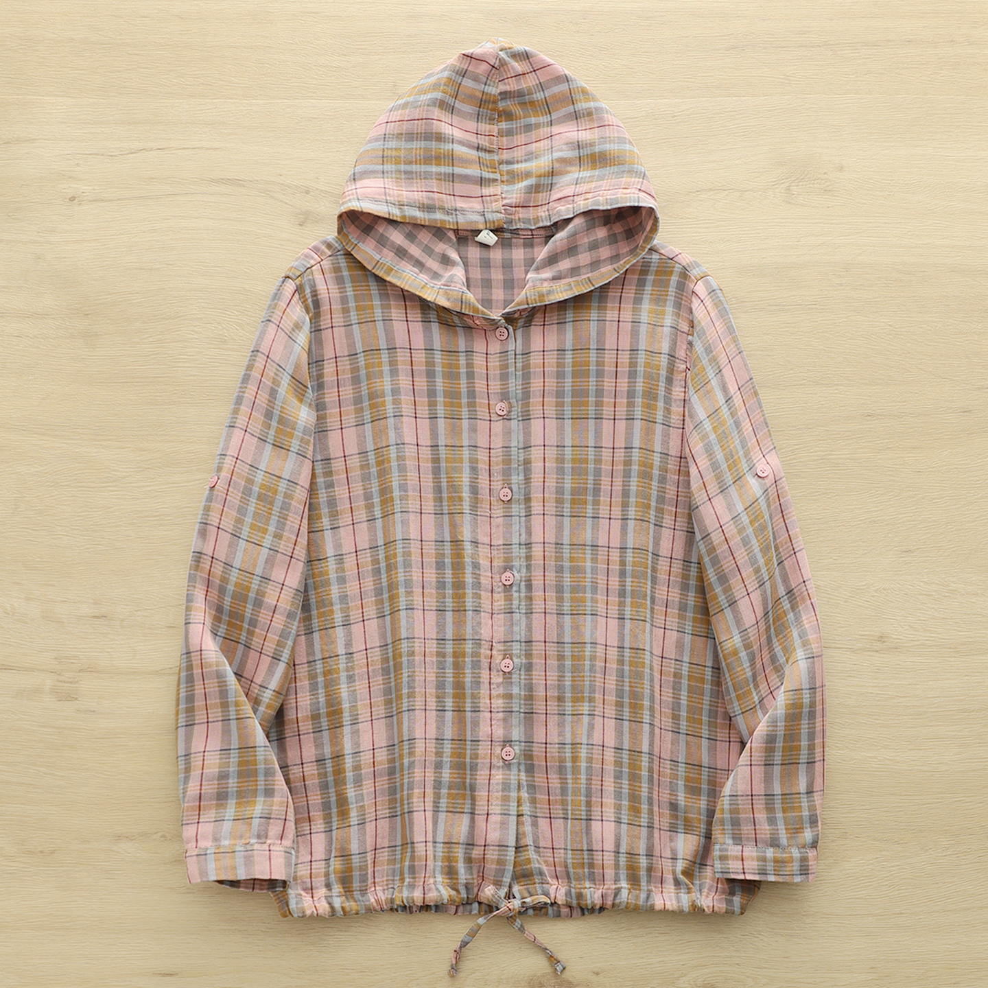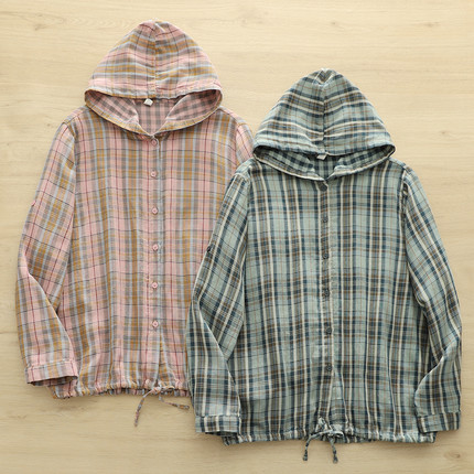 2025夏季文艺减龄格子双层棉纱连帽防晒衣女休闲短外套学生大码潮