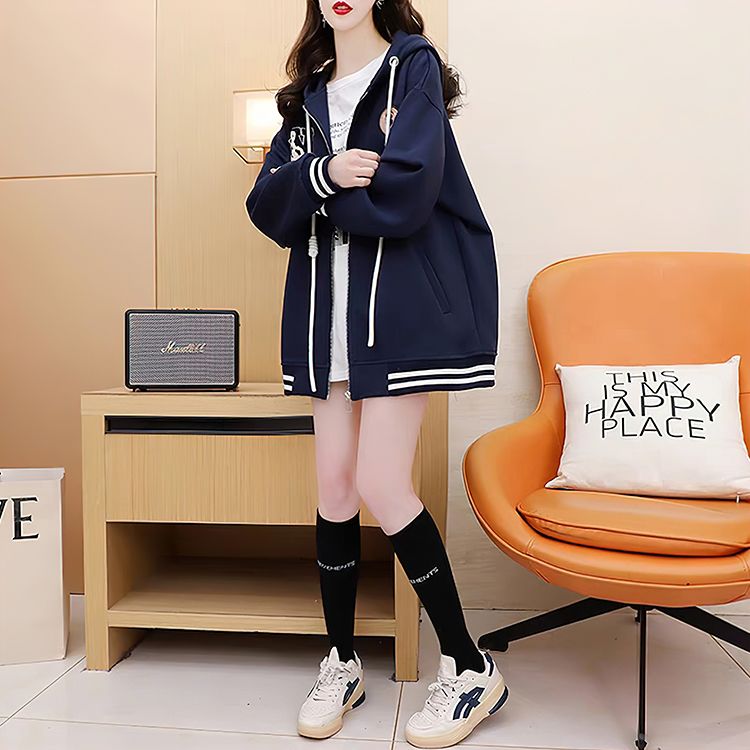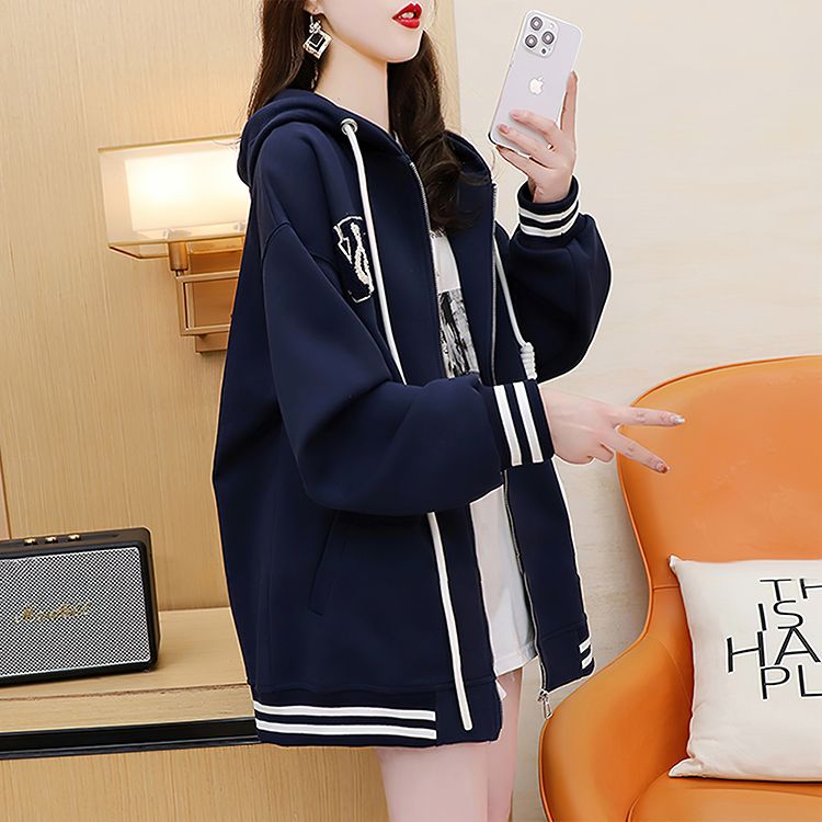 慵懒风连帽卫衣女开衫薄款刺绣中长款时尚网红加绒加厚上衣服外套