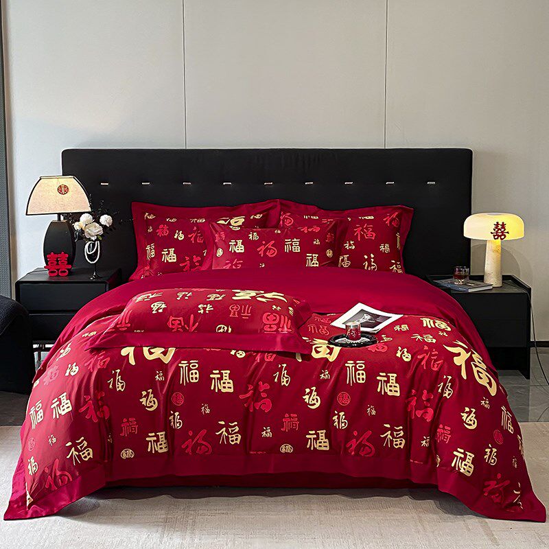 2024年新百福图四件套红色结婚被套婚庆床单全棉乔迁床上用品