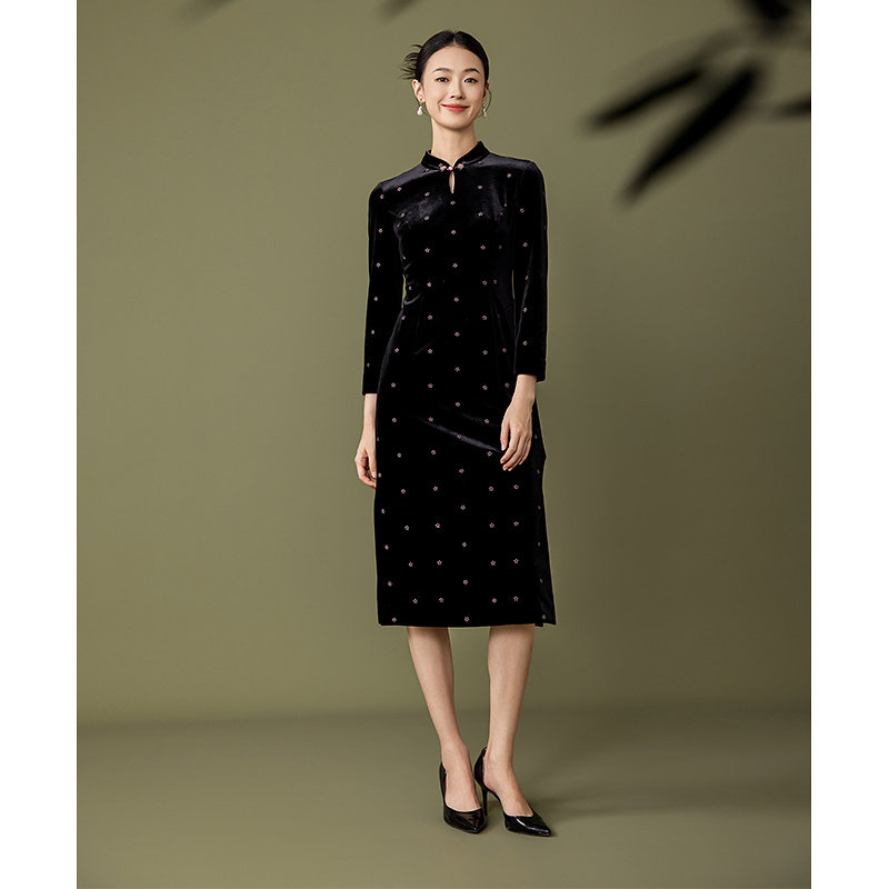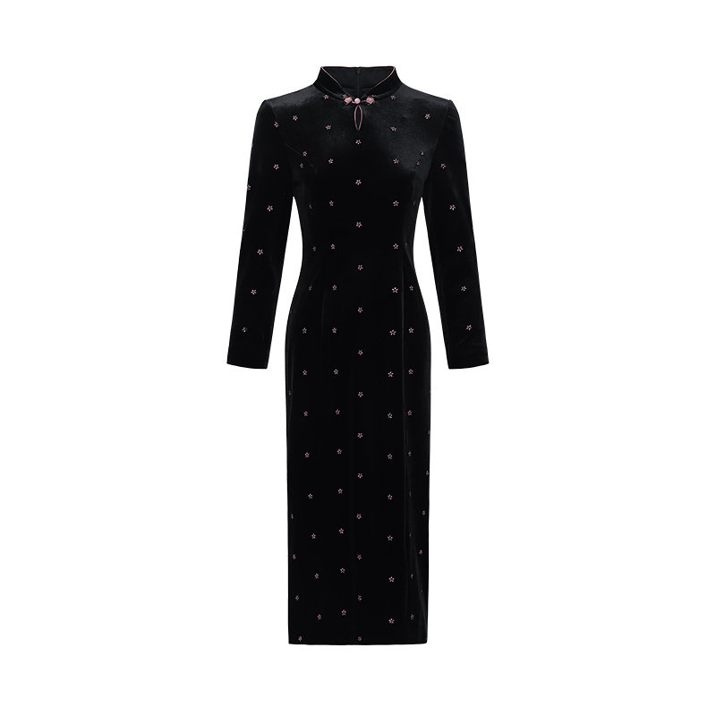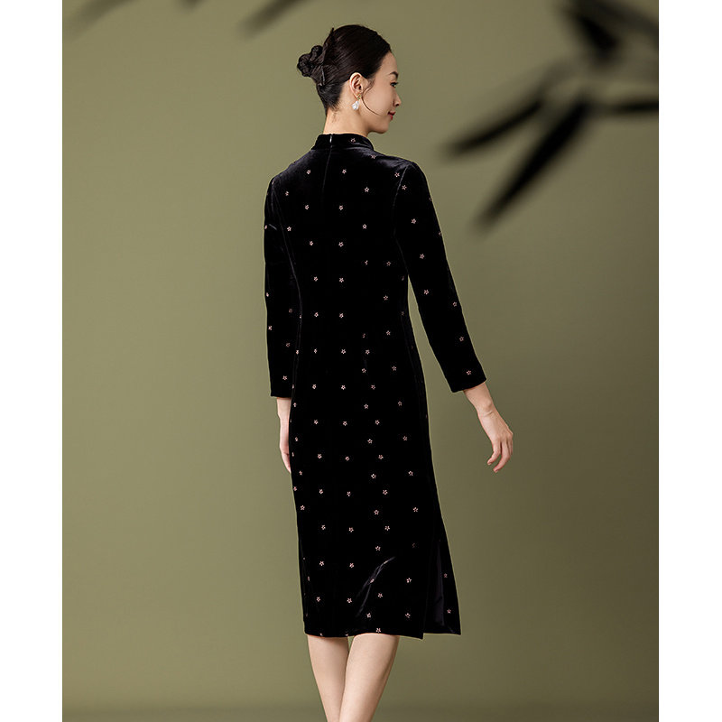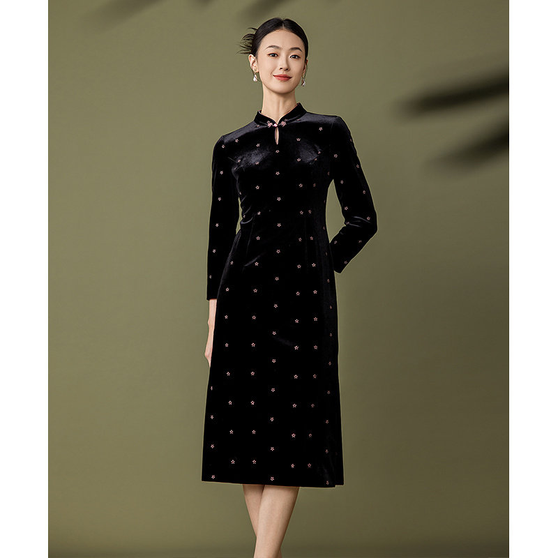 黛玛诗秋冬新款优雅复古国风绣花旗袍长款新中式丝绒连衣裙女长袖