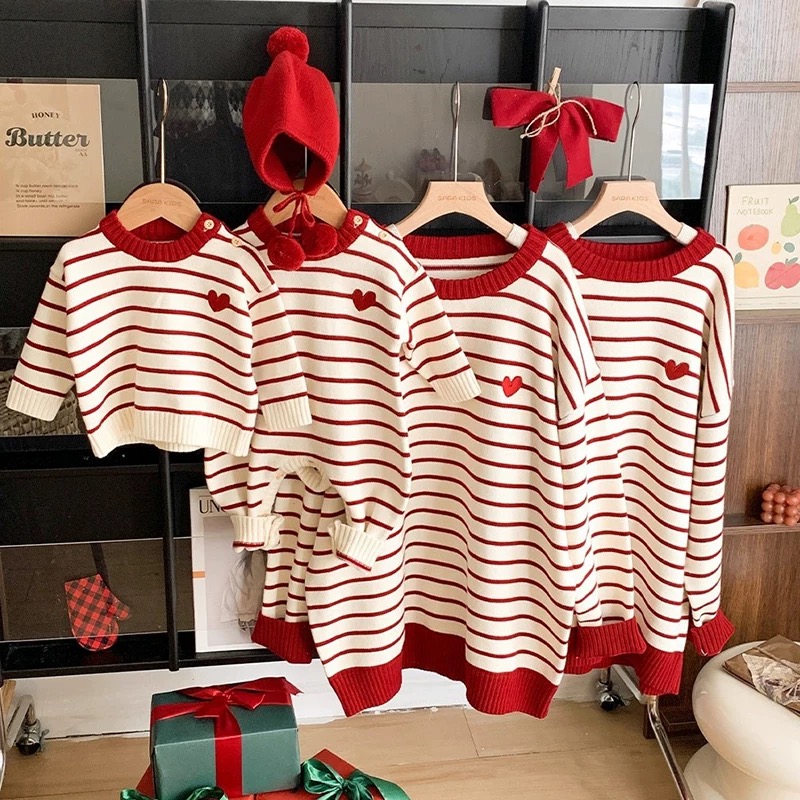 过年亲子装毛衣2025秋冬新男女童条纹针织衫一家三四口小月龄爬服