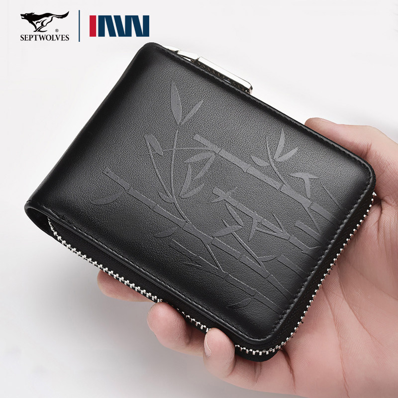 七匹狼男士半拉链钱包真皮短款钱夹纯头层牛皮三折横款皮夹子软皮