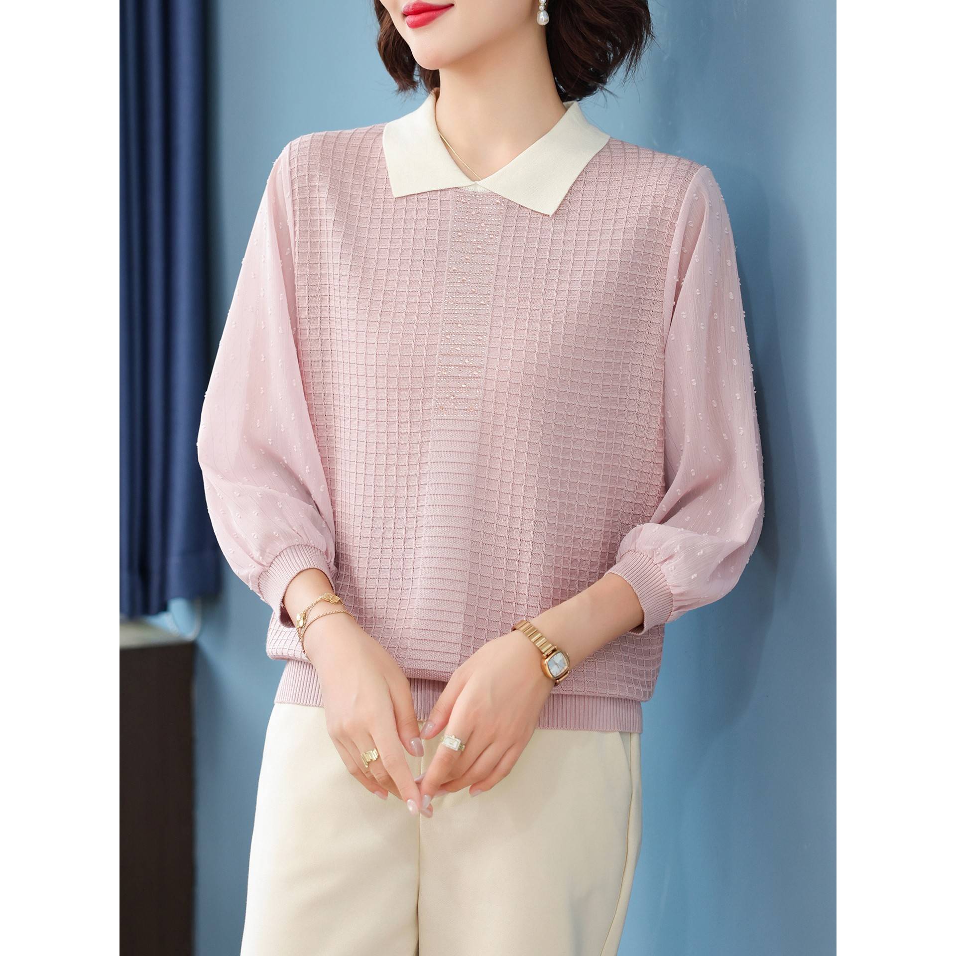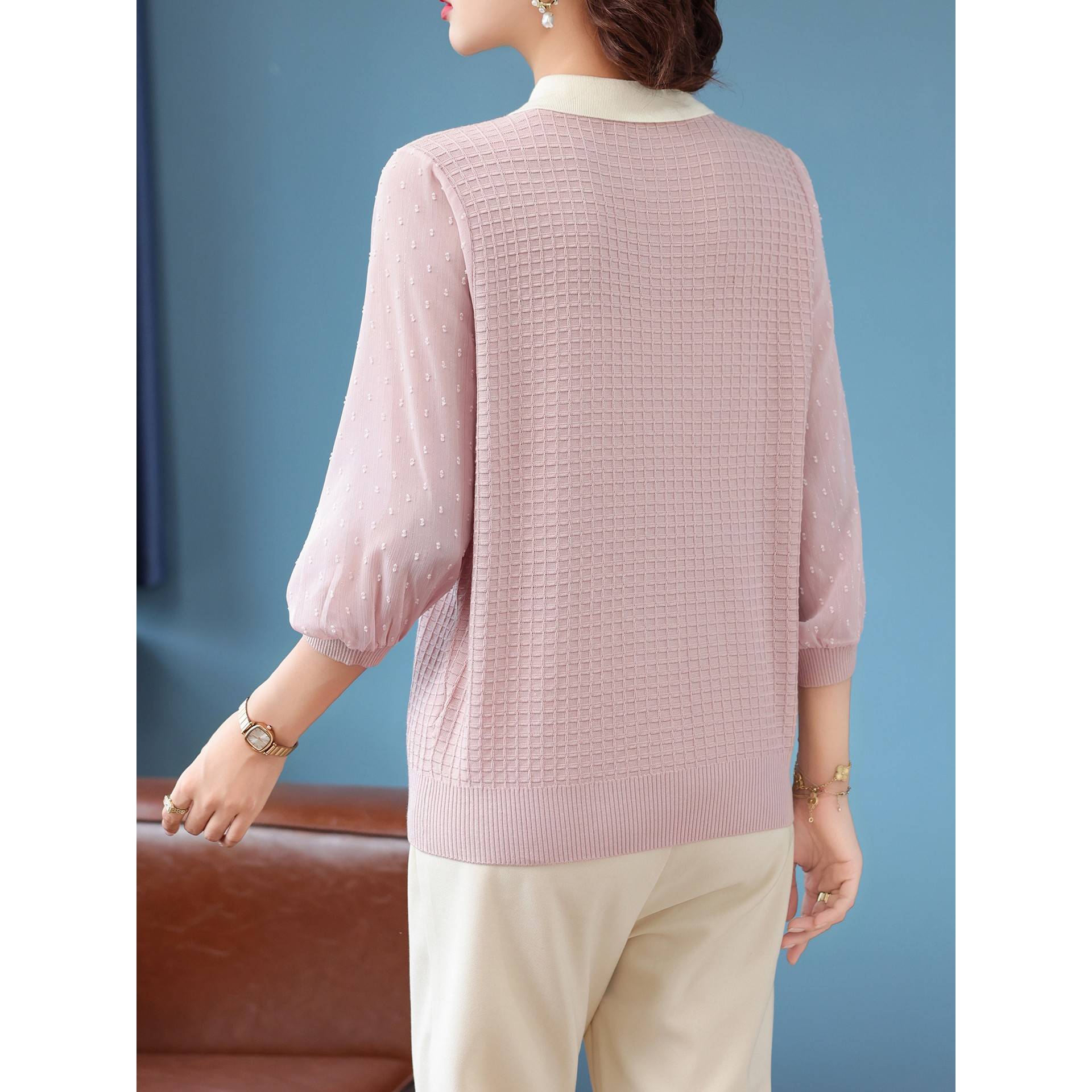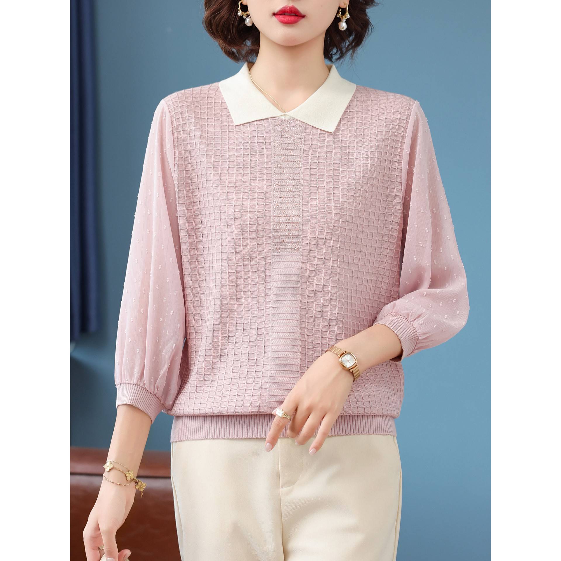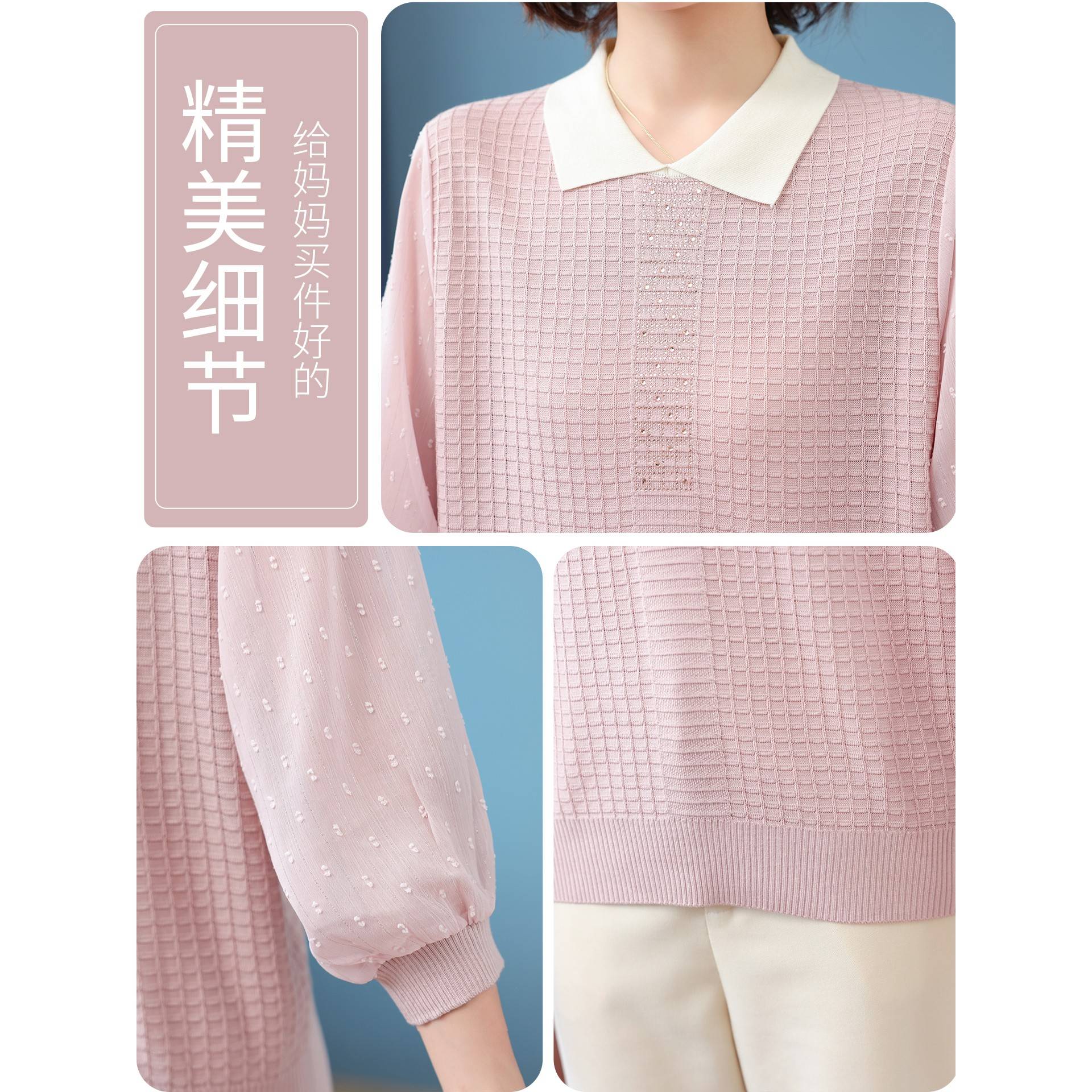 妈妈时尚针织打底小衫中年女装春秋装半袖T恤中老年洋气格子上衣