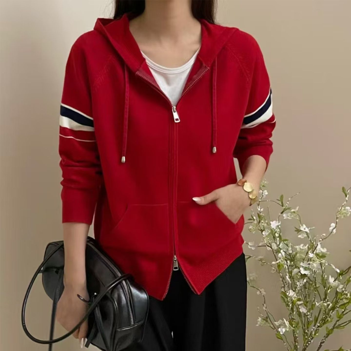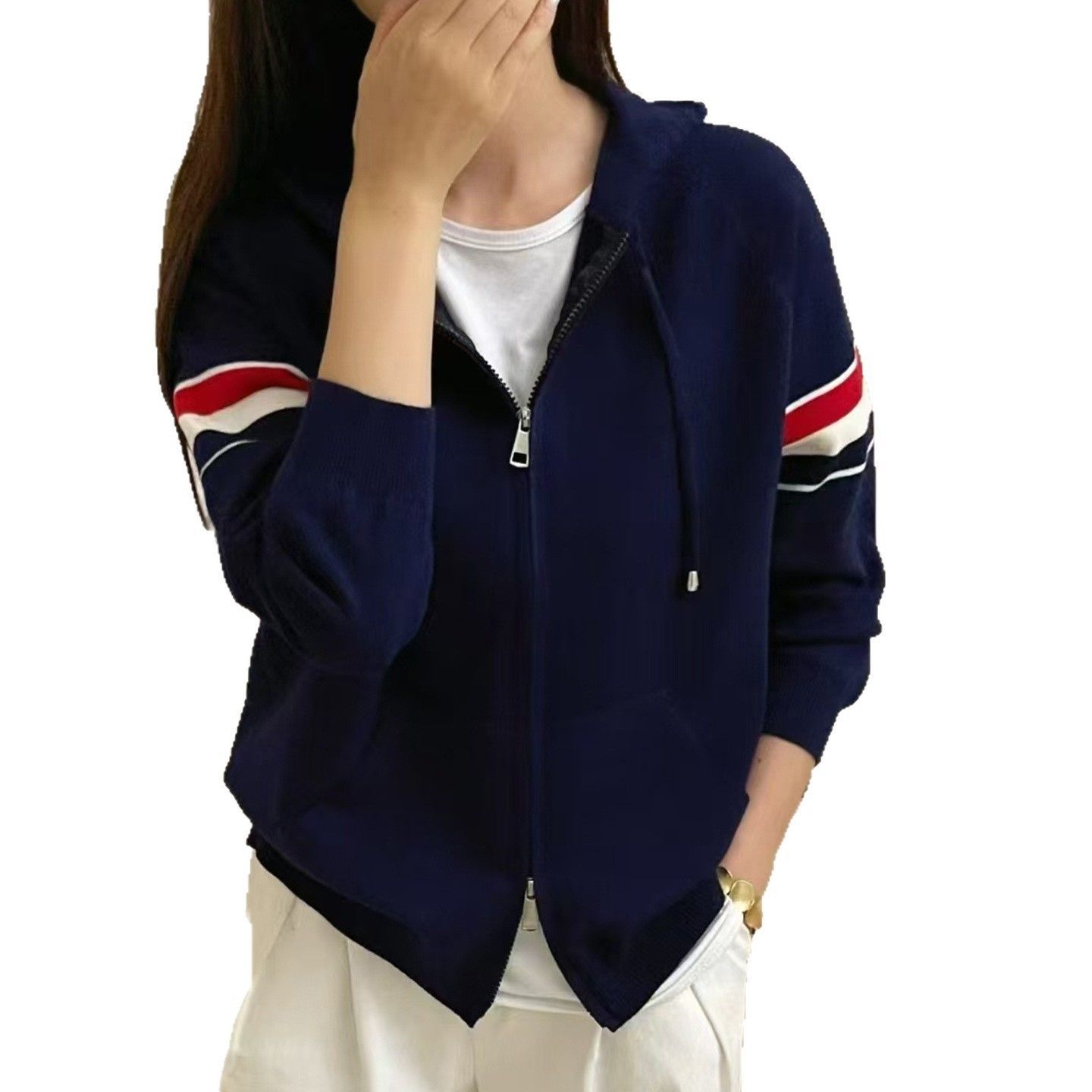 秋冬新款连帽针织开衫宽松休闲双袖彩条拉链毛衣外套卫衣女装上衣