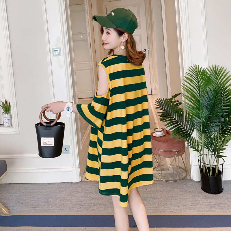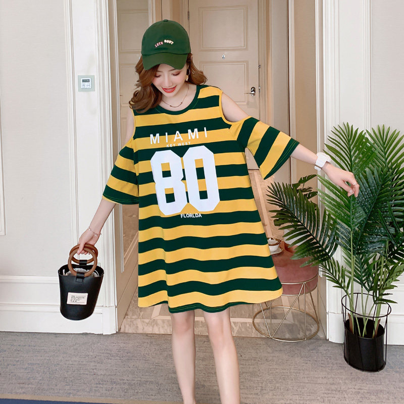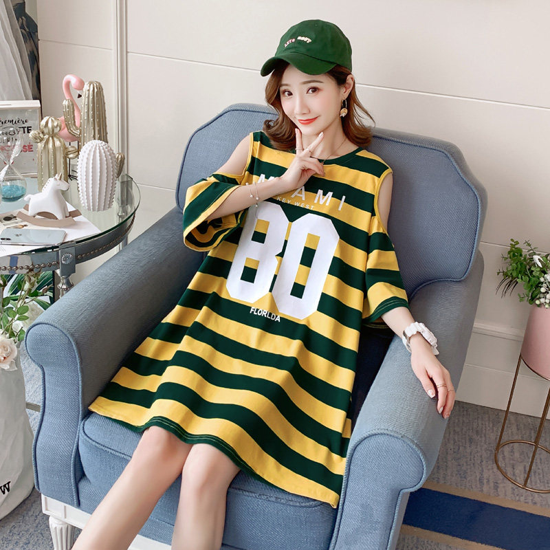 夏季新款韩版宽松漏肩连衣裙女学生上衣中长款纯棉条纹短袖t恤裙