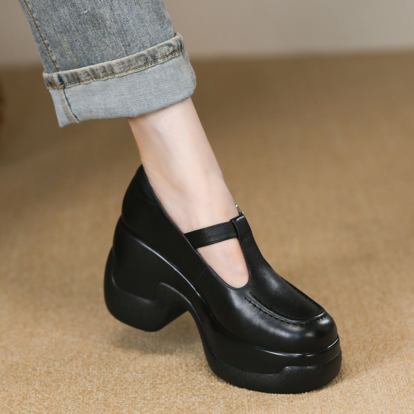 黑色浅口厚底单鞋女高跟秋季新款真皮丁字带防水台粗跟小皮鞋9cm