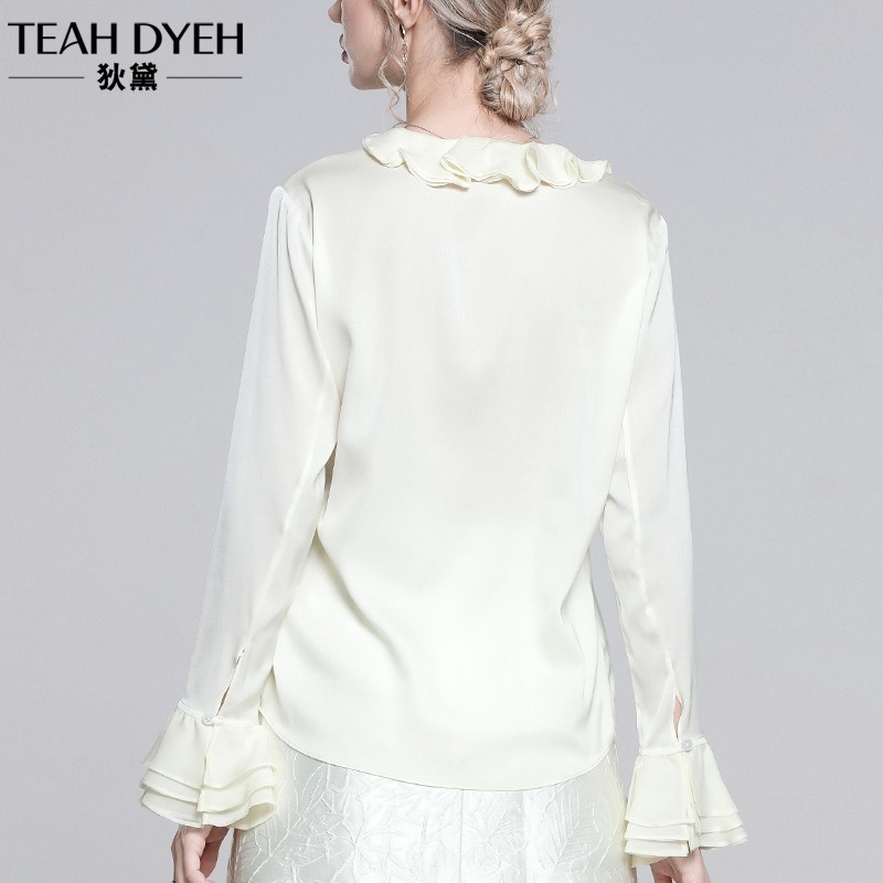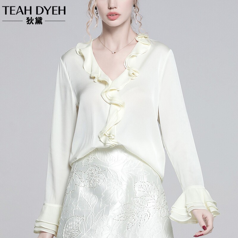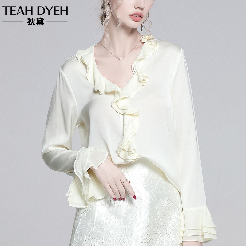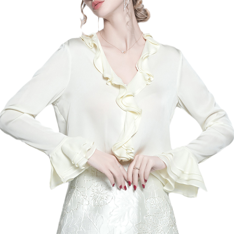 法式高端轻奢漂亮V领荷叶边桑蚕丝衬衫喇叭袖小衫白色真丝上衣女
