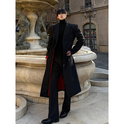 黑色红内西装毛呢大衣男款秋冬中长款高级感呢子外套正肩教父风衣