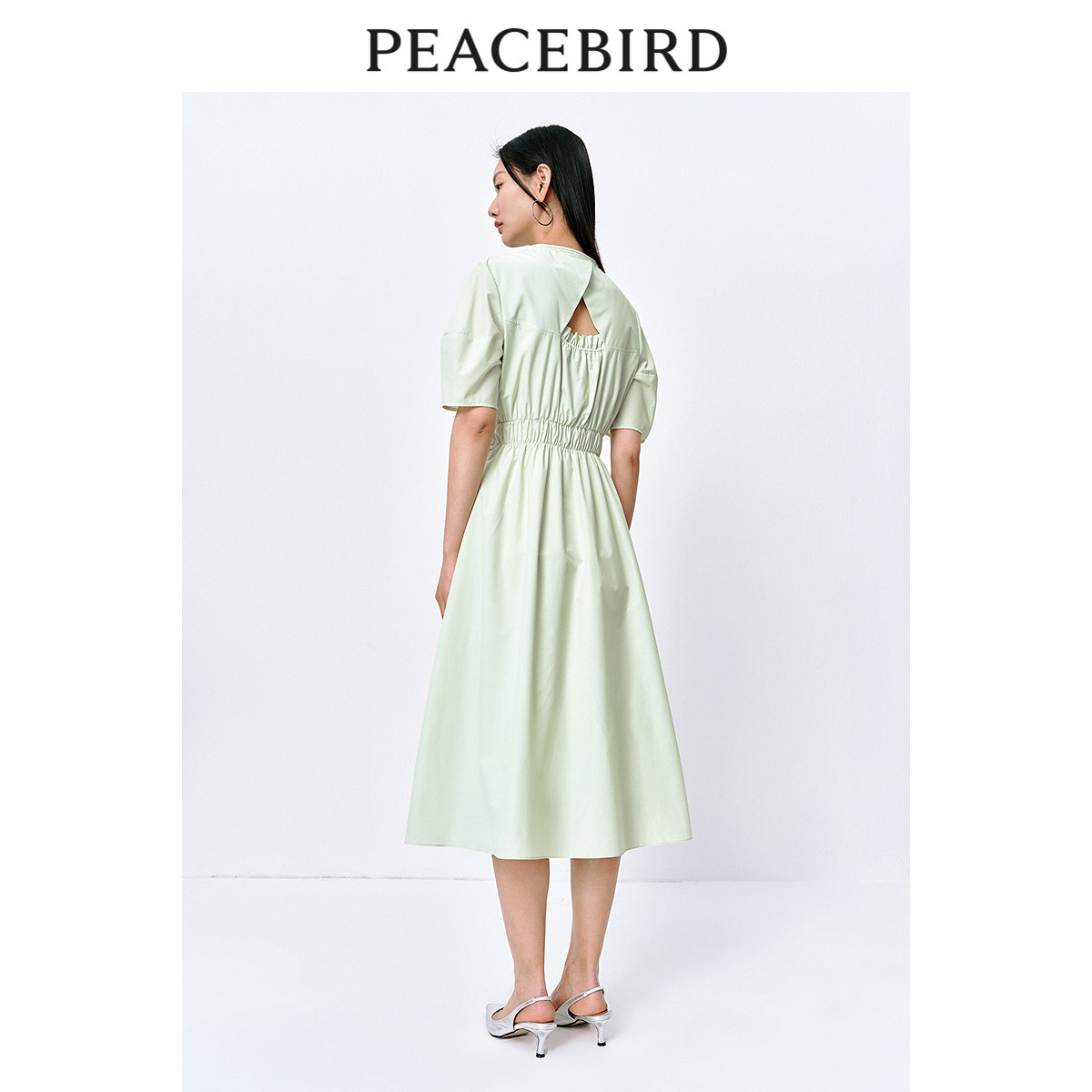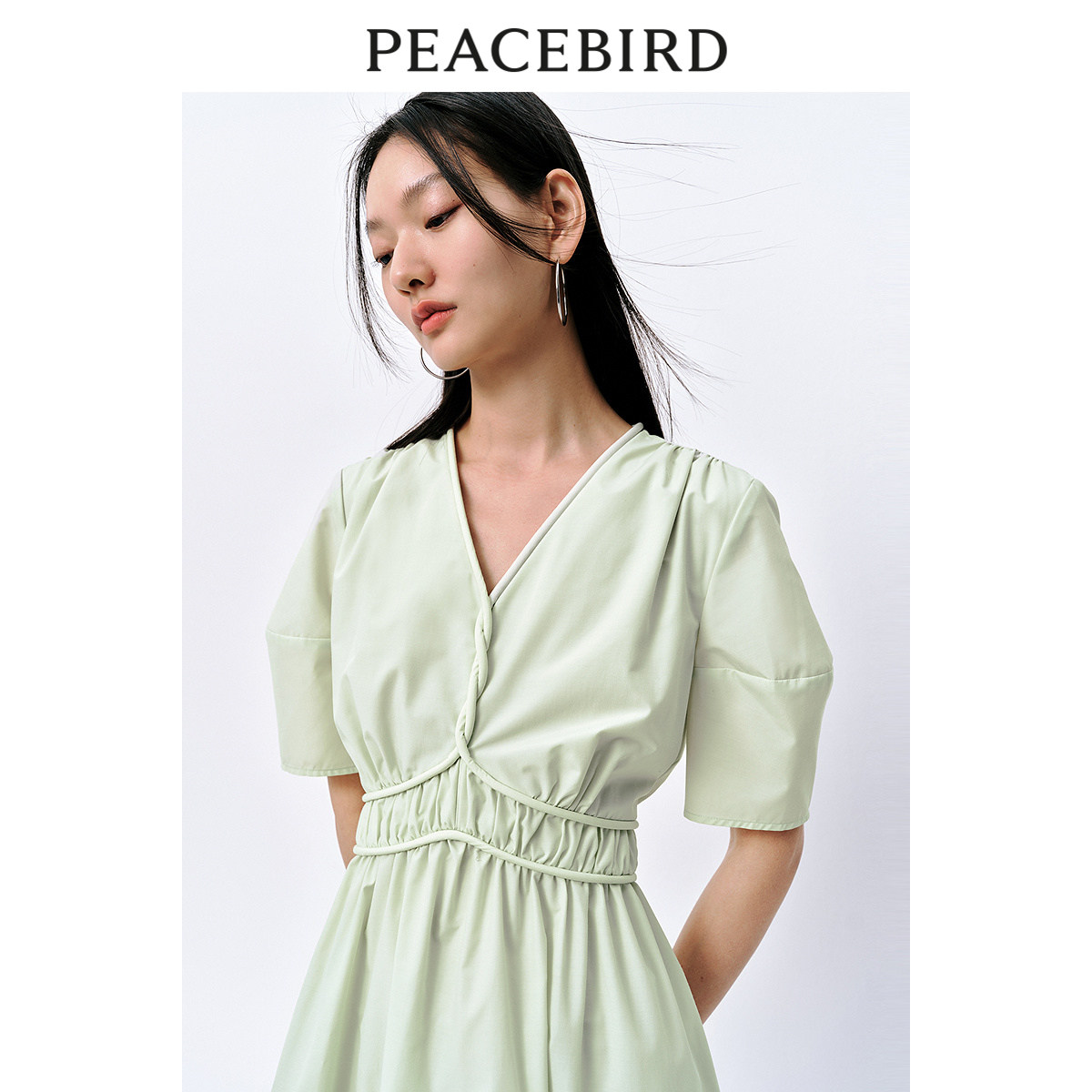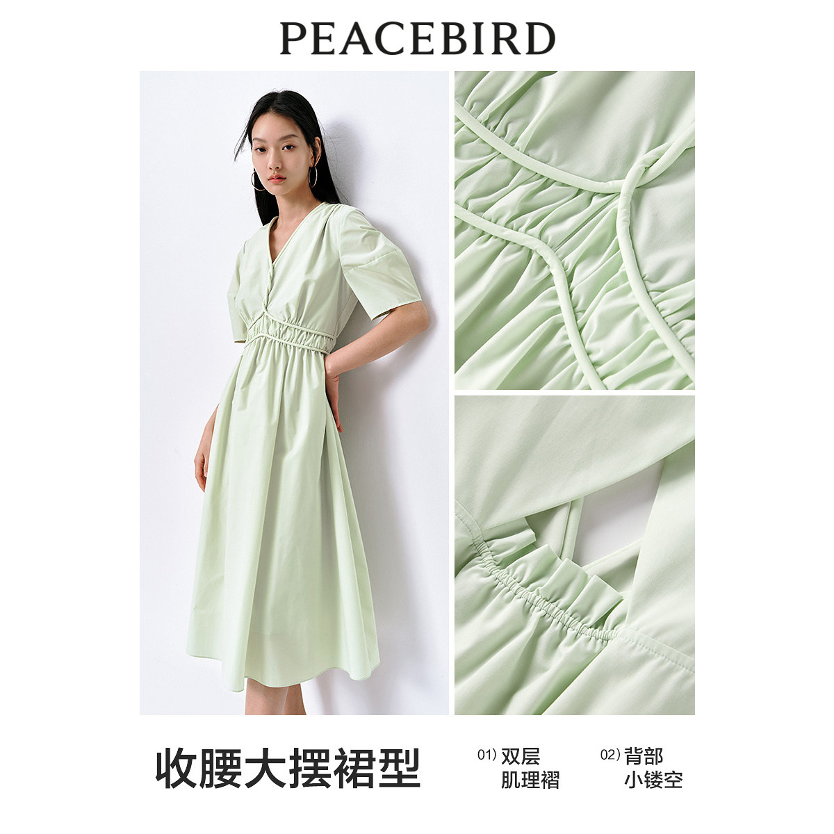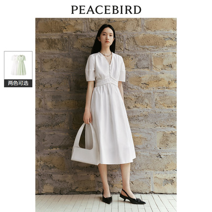 太平鸟通勤气质V领连衣裙夏高级小众收腰裙子薄荷曼波长裙女