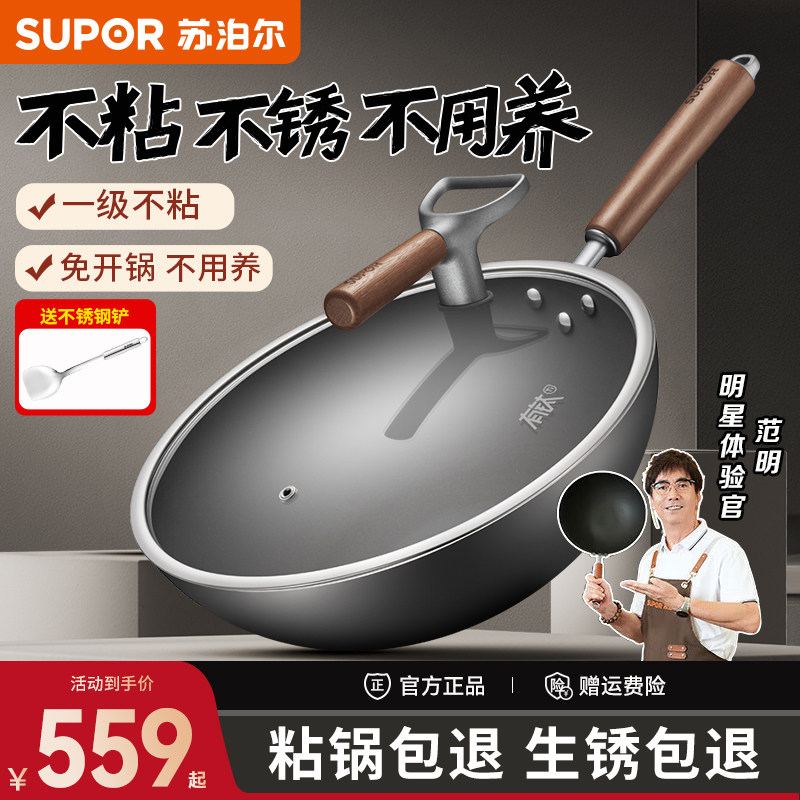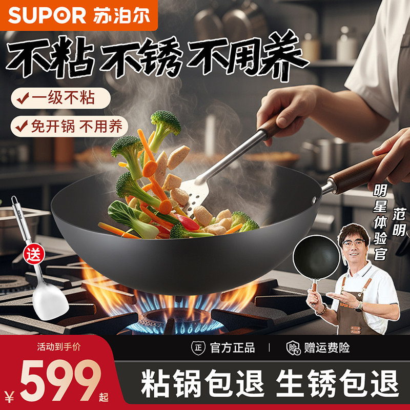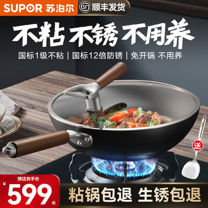 【商超同款】苏泊尔有钛无涂层不粘锅铁锅家用炒锅复合铁炒菜锅