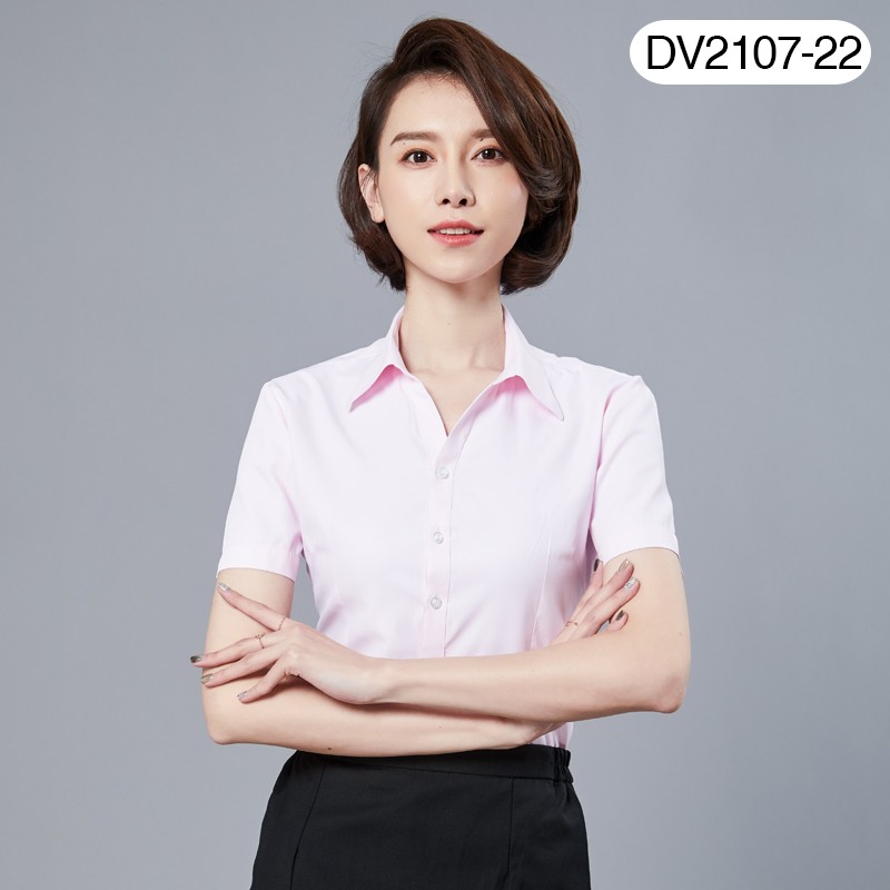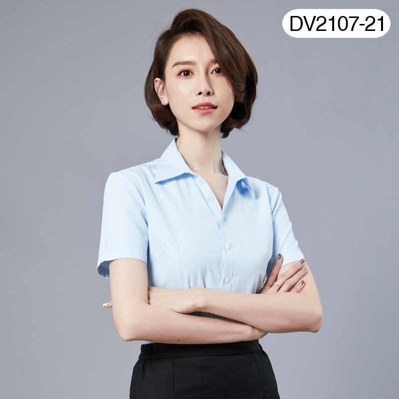 定制衬衫绣LOGO夏季薄款短袖绣花女职业工装修身V领浅蓝色斜纹