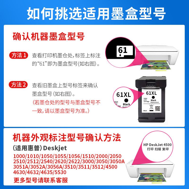 适用61XL墨盒HP1000 1050 1510 1010 2620 4630 1511 1011 2050 2622 2623 2510 Envy4500 2510 打印机墨水盒