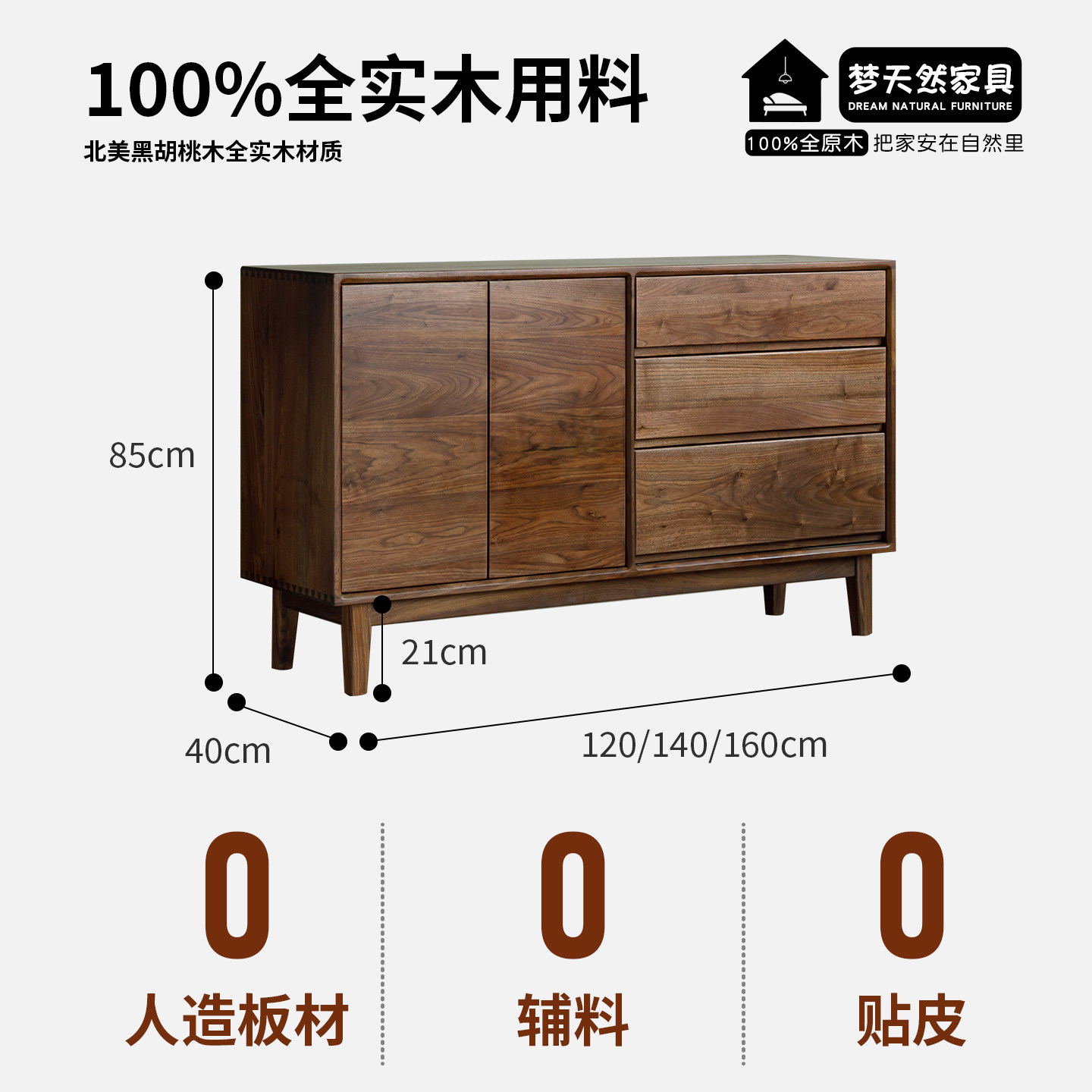 梦天然北欧餐边柜黑胡桃木储物柜