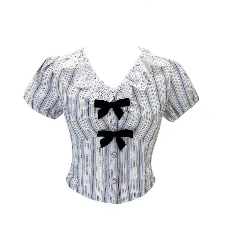 夏季法式条纹蕾丝花边衬衫V领甜酷小众设计显瘦百搭短款上衣女ins