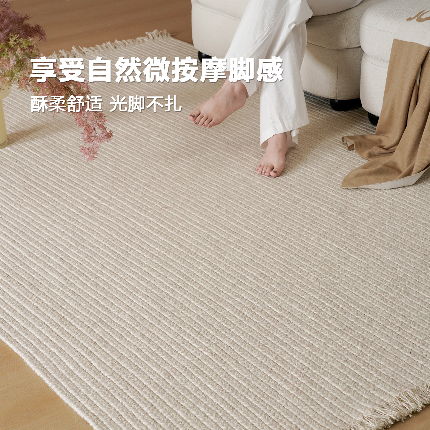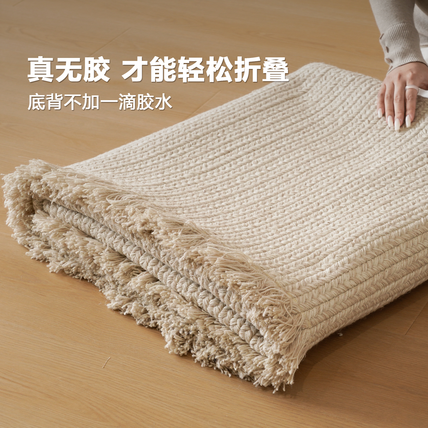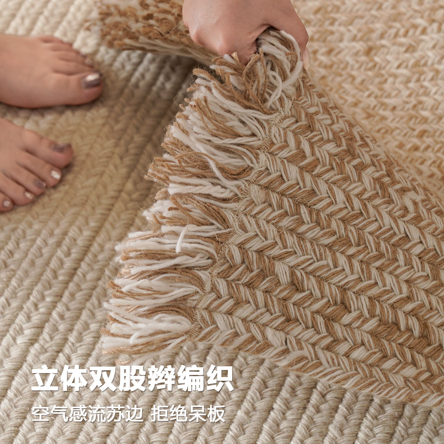 手工亚麻无胶羊毛地毯丨客厅高级感素色黄麻卧室床边毯流苏古臻