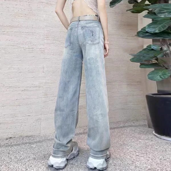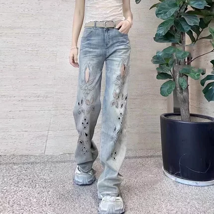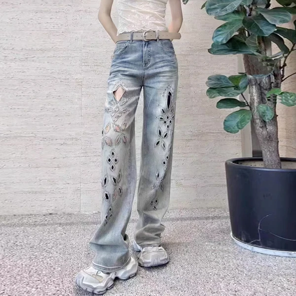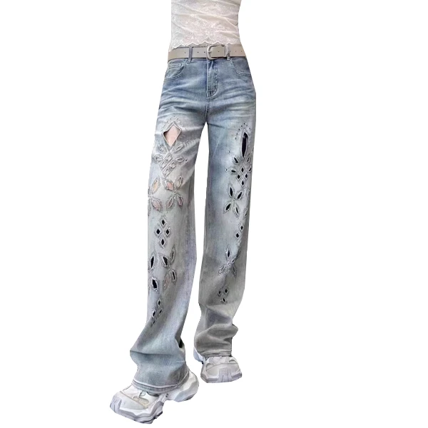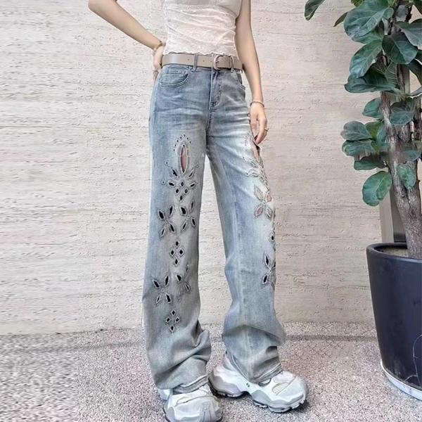 2025夏季镂空复古烫钻设计感做旧高街显瘦破洞水洗牛仔直筒裤女潮