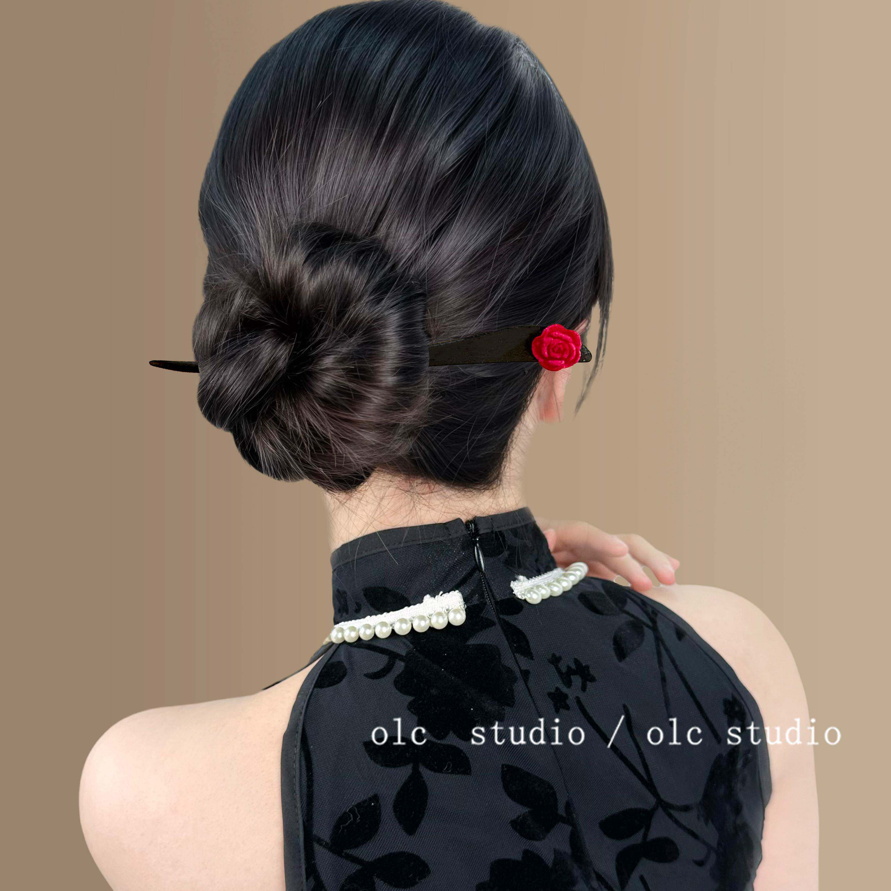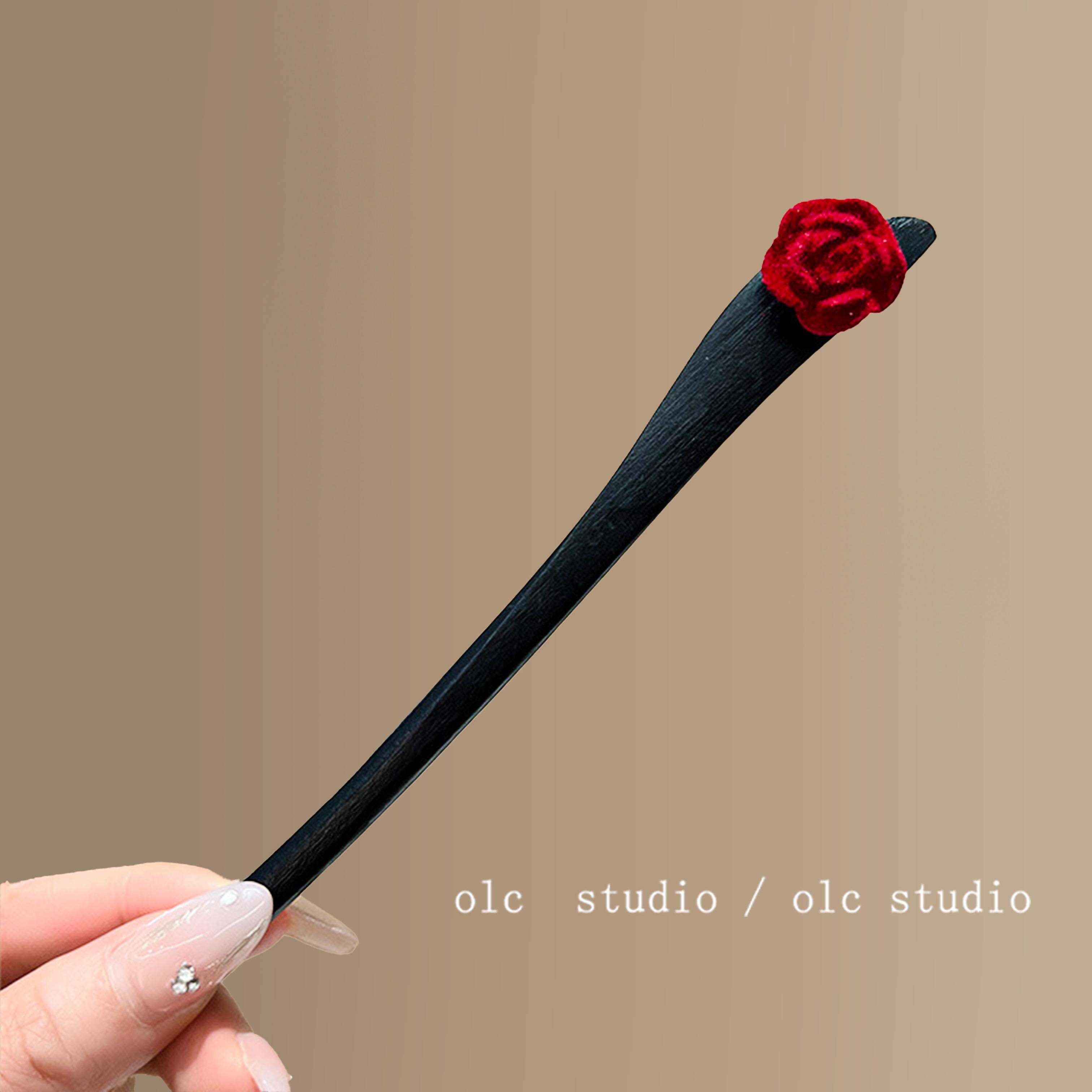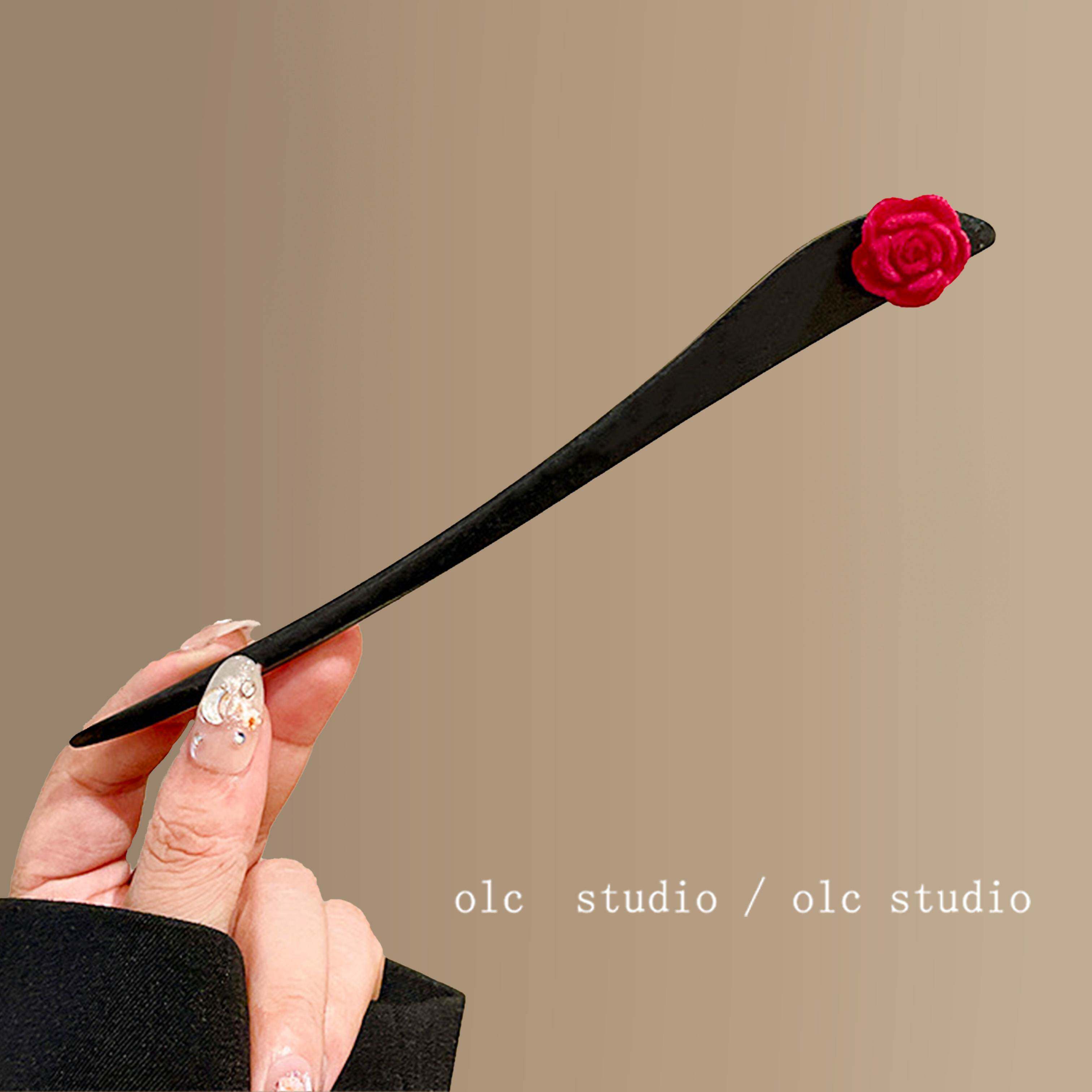 酒红玫瑰~新年盘发木质发簪~敬酒花朵头簪汉服旗袍日常盘发簪子