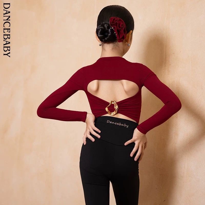 2024新款拉丁舞服秋冬练功时尚红色上衣女童跳舞舞蹈喇叭长裤套装