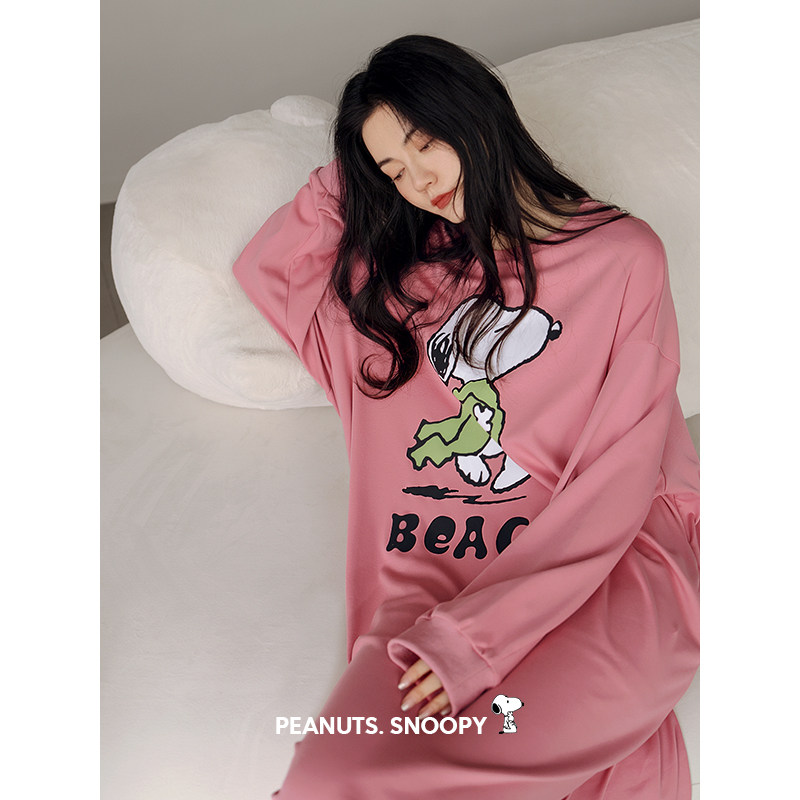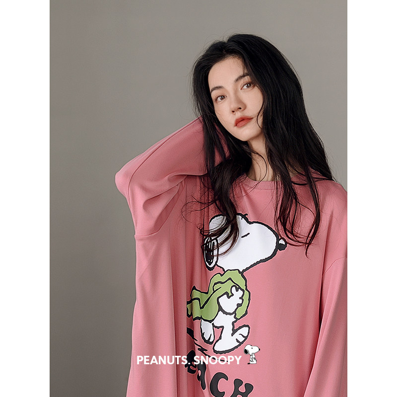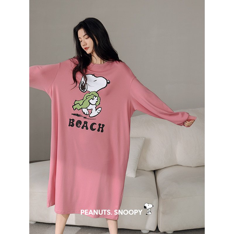 贝妍柔软棉睡衣女春秋新款可爱史努比睡裙甜美少女长袖宽松连衣裙