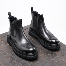 CW2025新款春季切尔西靴男真皮短靴英伦风马丁靴布洛克雕花厚底黑
