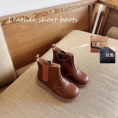 复古儿童牛皮短靴真皮布洛克靴子单靴男女童棕色切尔西靴软底加绒