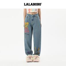 【商场同款】LALABOBO25年夏季牛仔裤女原创新款直筒小熊印花裤子