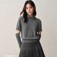 NEELLY纳俪春季新款商场同款100%绵羊毛小立领短袖针织衫毛衣女