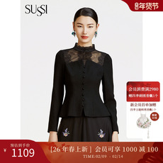 SUSSI/古色冬商场同款黑色立领前领口透视长袖上衣女