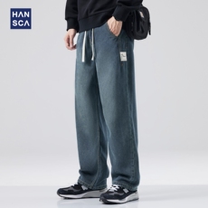 hansca蓝色直筒牛仔裤男秋季水洗宽松休闲长裤复古潮牌痞帅阔腿裤