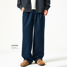 豪霆.复古水洗深蓝原色牛仔裤男松紧腰宽松直筒阔腿休闲垂感长裤