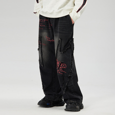 LAMLICKA美式闪电贴布阔腿牛仔裤男春秋潮牌涂鸦水洗宽松直筒长裤