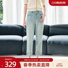 歌蒂诗春夏专柜新款卷边浅蓝色直筒复古水洗牛仔9分裤女8F21N3875