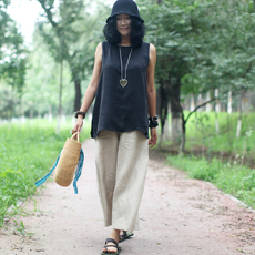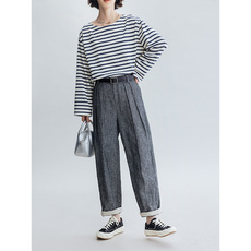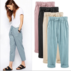 Dotdrobe多着 棉麻卷边哈伦9分日系休闲裤女松紧腰-花灰/牛仔蓝