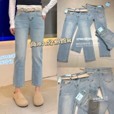 做旧浅色水洗牛仔柔软舒适搭藏肉好穿9分裤弯刀裤牛仔裤(配腰带)