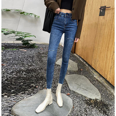 紧身破洞白色牛仔裤女九分小脚裤春秋薄弹性乞丐毛边9分铅笔裤子