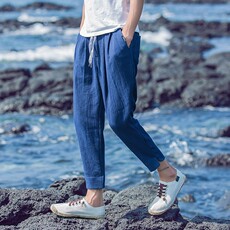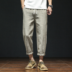 夏季潮流薄款棉麻九分裤男休闲大码亚麻9分百搭韩版潮流宽松裤子
