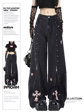 PMORH 美式复古黑色高街工装牛仔裤女春季显瘦高腰直筒阔腿拖地裤
