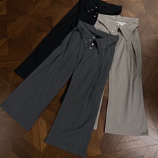 三福休闲裤2026新款夏季宽松高腰显瘦阔腿裤直筒灰色坑条裤子女装