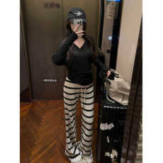 暴走高仙女175高个子慵懒条纹针织微喇裤女春秋镂空加长遛弯长裤