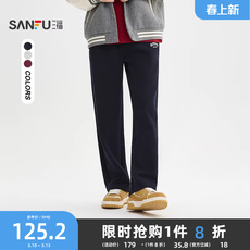 三福2026春季英文刺绣针织卫裤休闲裤男宽松直筒撞边长裤515669
