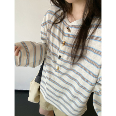 REACH斜肩条纹长袖T恤女春季新款休闲宽松显瘦设计感修身路肩上衣