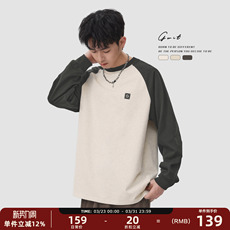 红风 复古纯色长袖亨利领T恤男开春圆领宽松重磅纯棉情侣打底衫