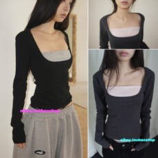 eihey诶嘿美式复古长袖T恤女春季新款修身内搭假两件百搭打底上衣