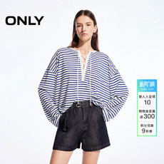 ONLY2026春季新款航海风随性绑带设计宽松落肩条纹长袖上衣T恤女