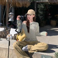 3MER哦哦三妹 美式复古斜肩条纹长袖T恤女春韩系慵懒宽松收腰上衣