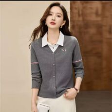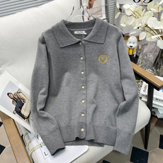 胡子叔大码女装灰色刺绣polo翻领针织开衫秋冬复古慵懒学院风毛衣