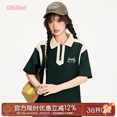 Gbiaior拼接设计感墨绿色显白学院风短袖polo衫t恤女透气翻领上衣
